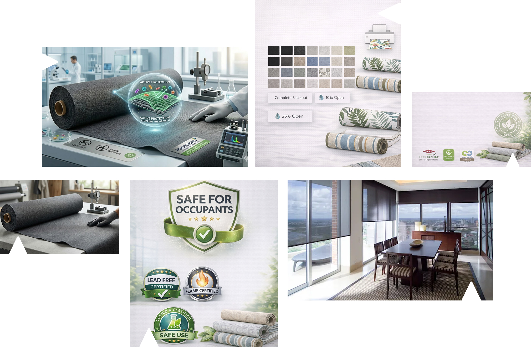 Our roller shade fabrics support LEED-certified projects and are designed with sustainability in mind. They feature advanced eco-friendly components such as DOW ECOLIBRIUM™ bio-based plasticizers, GREENGUARD certification, and Cradle to Cradle Certified™ Bronze standards.