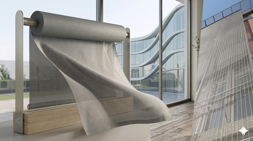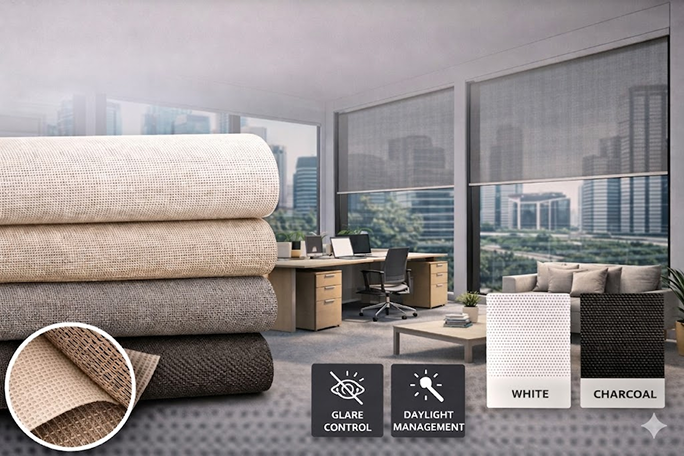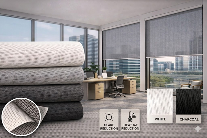 An eco-friendly fabric designed to minimize heat gain while preserving clear visibility to the outside.