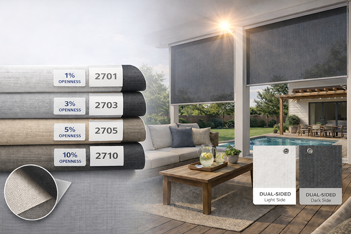 SheerWeave 2701, 2703, 2705, and 2710 provide outstanding heat and glare reduction. These dual-sided fabrics are suitable for both indoor and outdoor applications.