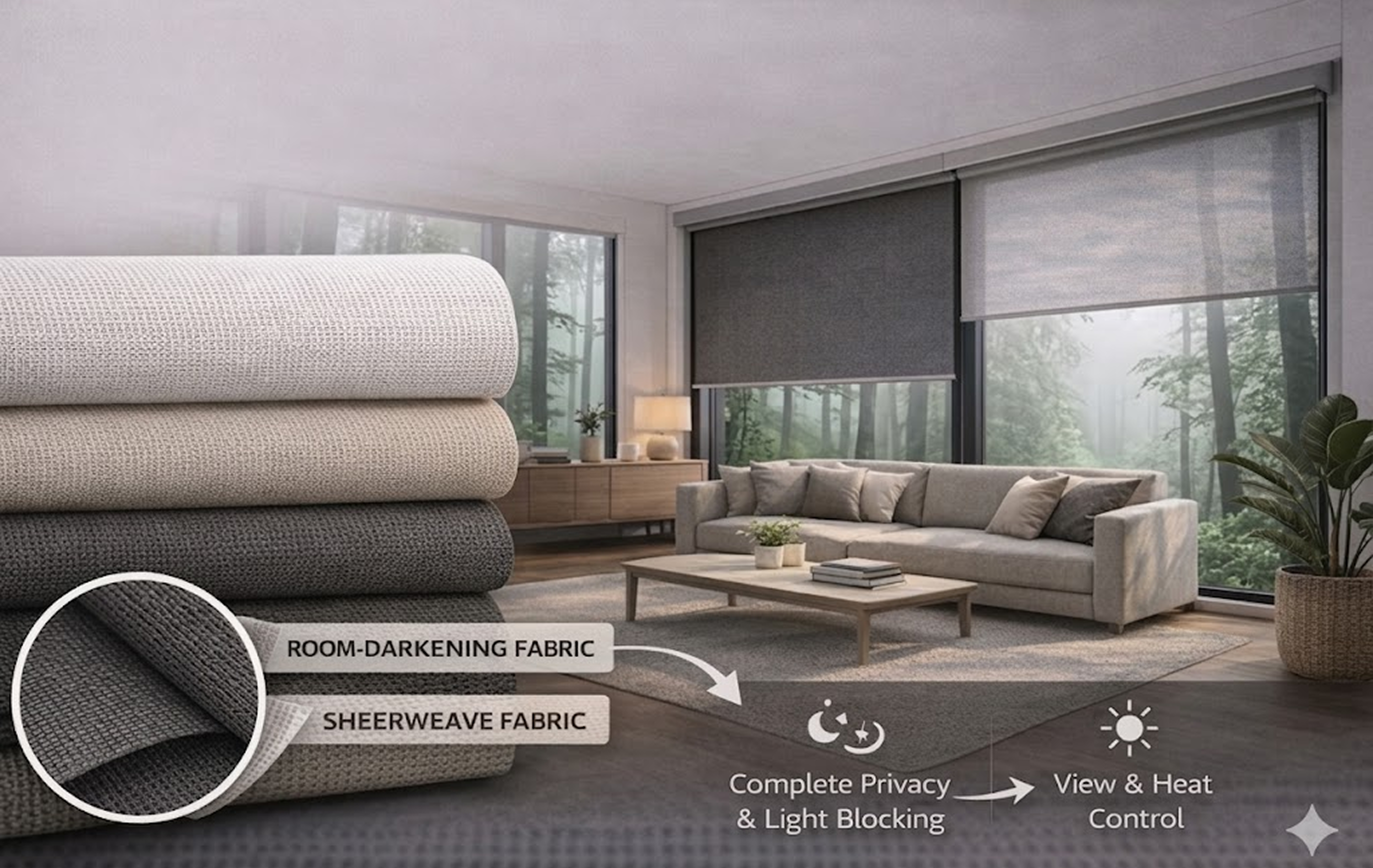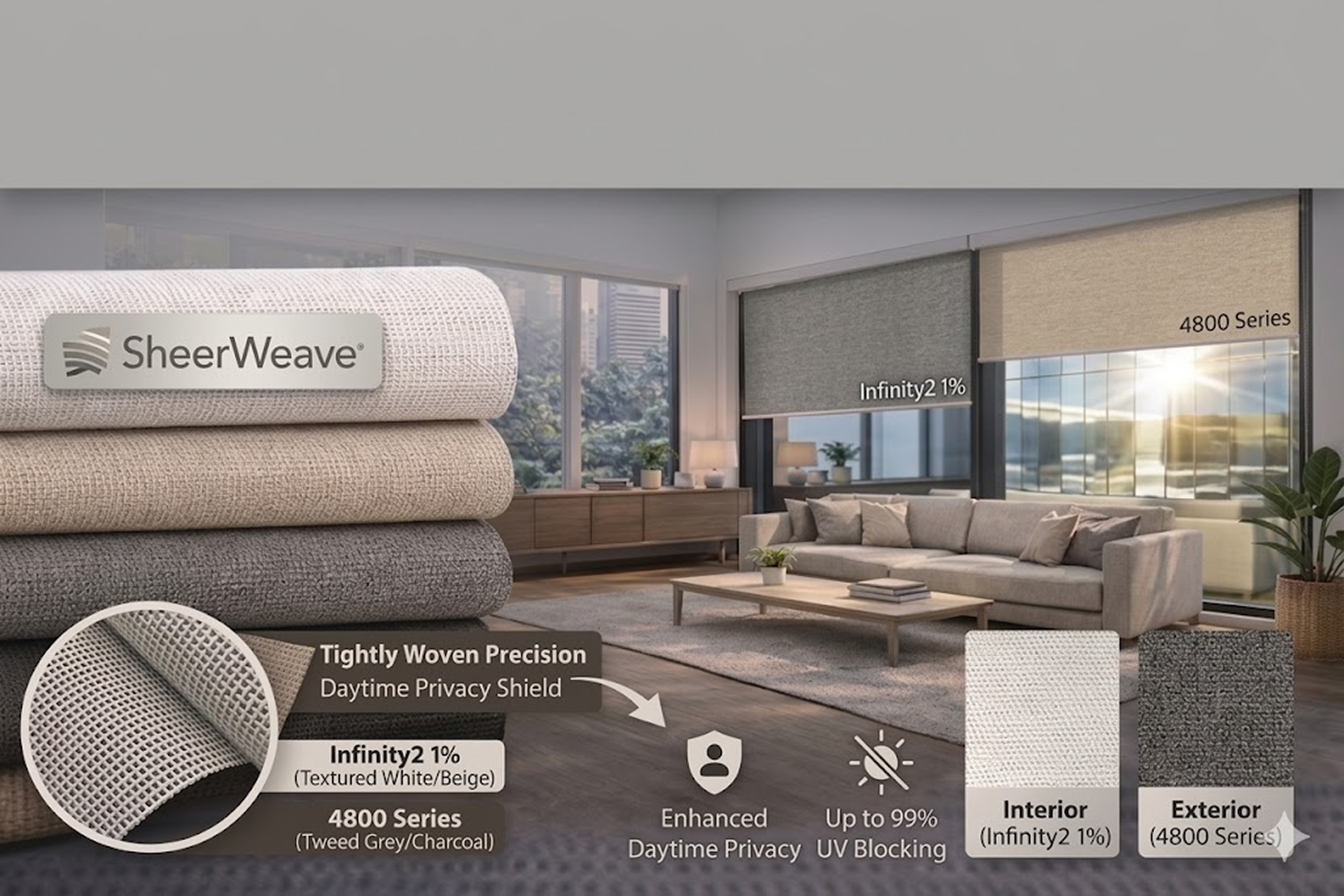 SheerWeave fabrics integrate smoothly with dual roller systems, allowing homeowners greater flexibility in controlling light and privacy. For optimal performance, combine a room-darkening fabric for complete privacy and light blocking with a more open SheerWeave fabric to manage heat, light, and maintain clear outside views.