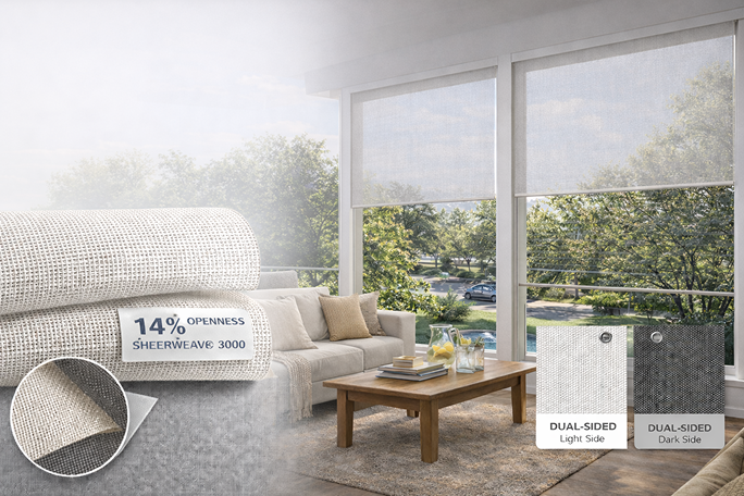 SheerWeave 3000 offers 14% openness, allowing natural light to filter in while providing clear outward visibility. Ideal for both interior and exterior roller shades, SheerWeave 3000 enhances your space with balanced light control.