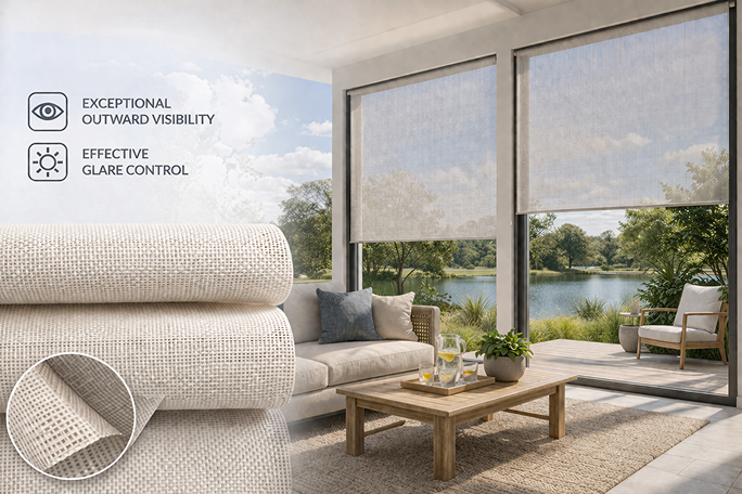 An advanced solar screen fabric designed to provide optimal daylight control and reduce glare, perfect for contemporary interiors.