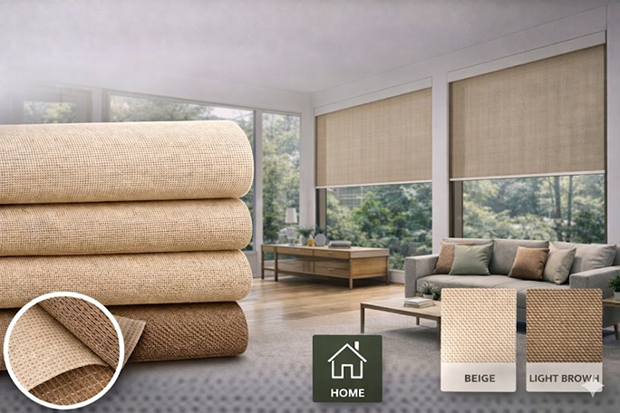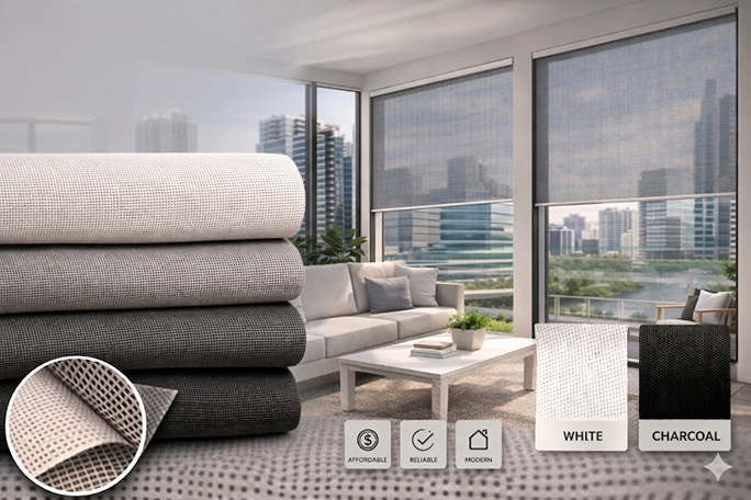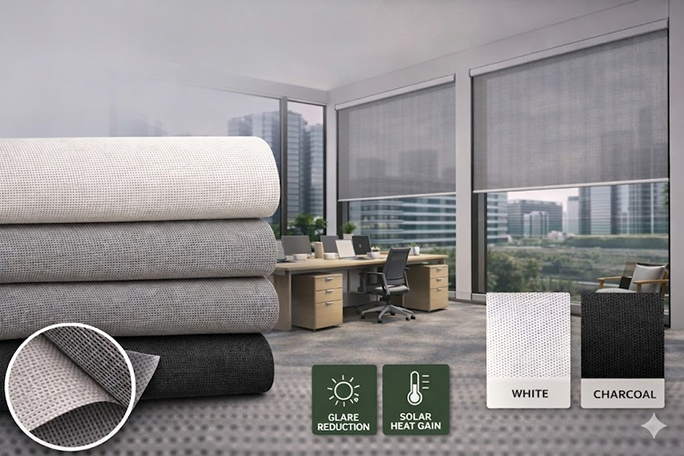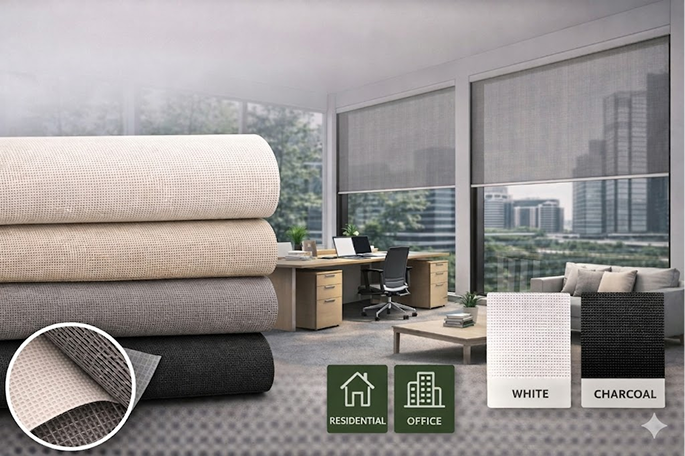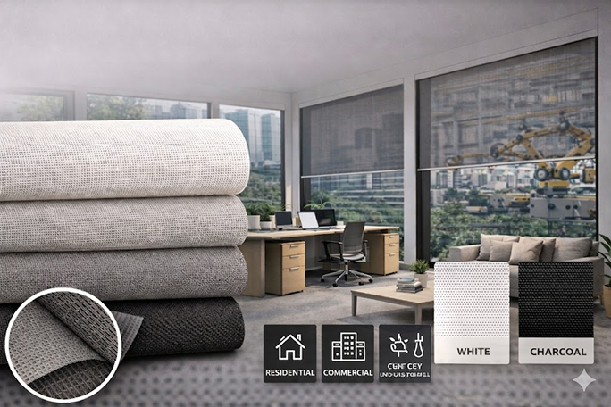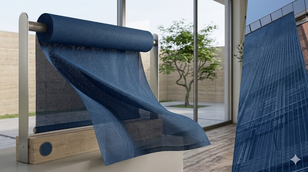 An eco-friendly fabric designed to minimize heat gain while preserving clear visibility to the outside.