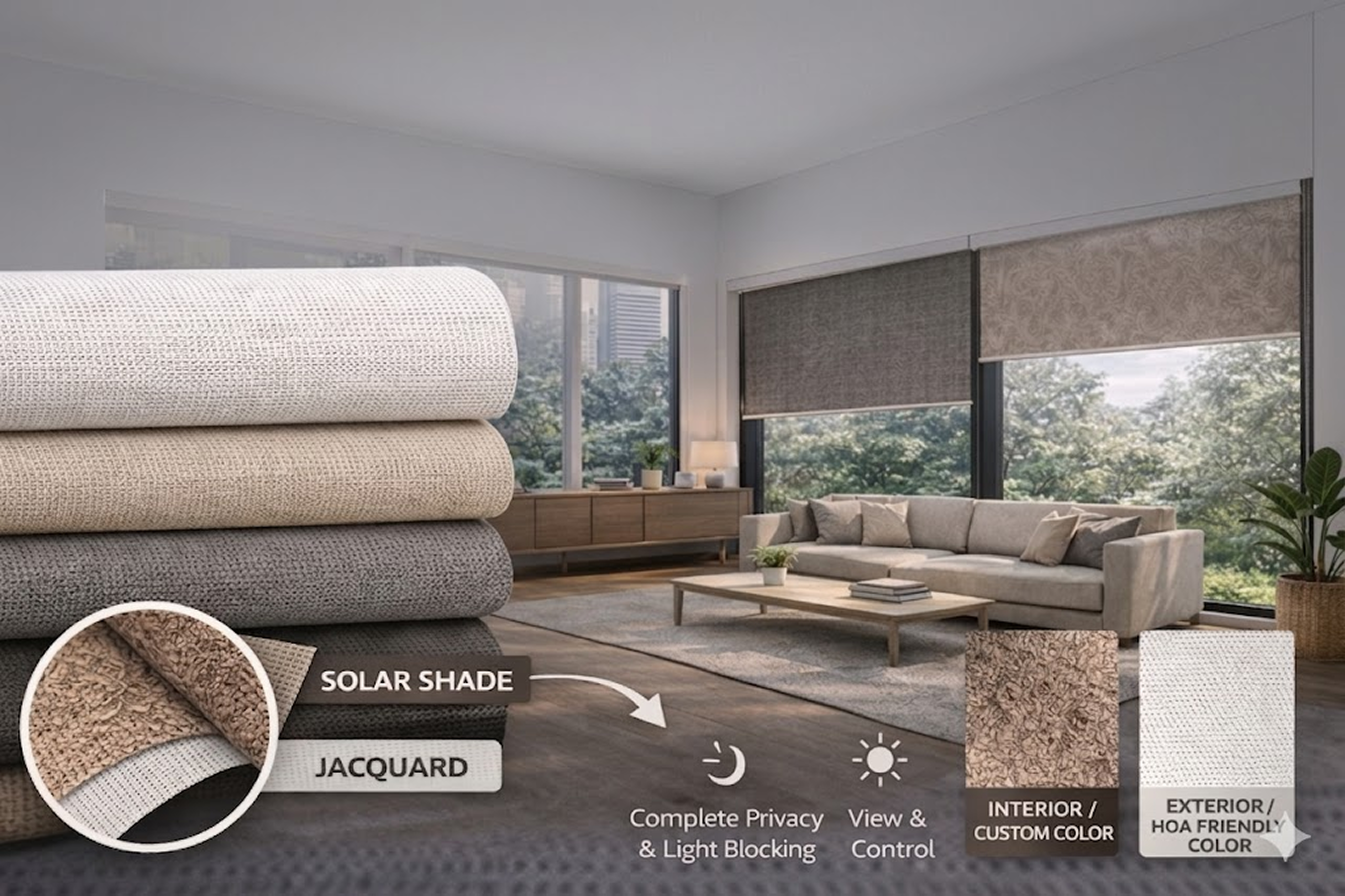 SheerWeave fabrics are available in a variety of colors and textures to complement any interior style, from traditional solar shades to rich jacquard designs. For HOA compliance, dual-sided options provide a consistent exterior look while still allowing customized colors inside.